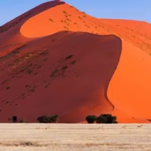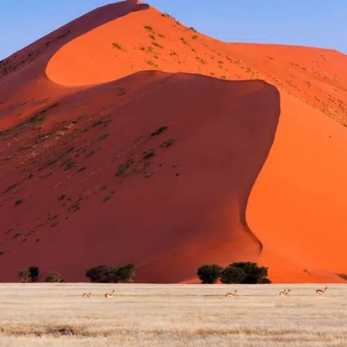 La Namibie est une destination extra-ordinaire, et ne doit pas être comparée à ses voisins d’Afrique Australe. Plus sauvage, plus désertique, moins animalière, plus aventurière. Avec l’une des densités humaines les plus faibles au monde, et un réseau de pistes quasi entièrement non bitumées, le pays est réservé aux adaptes de la contemplation, de la solitude, de l’isolement. Un safari en Namibie ne se concentre pas exclusivement sur l’observation d’une faune dense, possible uniquement dans le parc national d’Etosha, mais également sur l’expérience de partir à la recherche d’animaux plus rares : les rhinocéros, lions et éléphants du désert dont ils ne restent que quelques centaines d’individus, représentent le graal en terme d’observation. Mais d’autres rencontres font partie du voyage et de l’excitation de rouler sur des pistes : oryx, hyènes brunes dans les zones arides, suricates dans le Kalahari ou encore otaries à fourrure en colonies sur la côte des squelettes… ce sont des ambiances que l’on traque en Namibie.